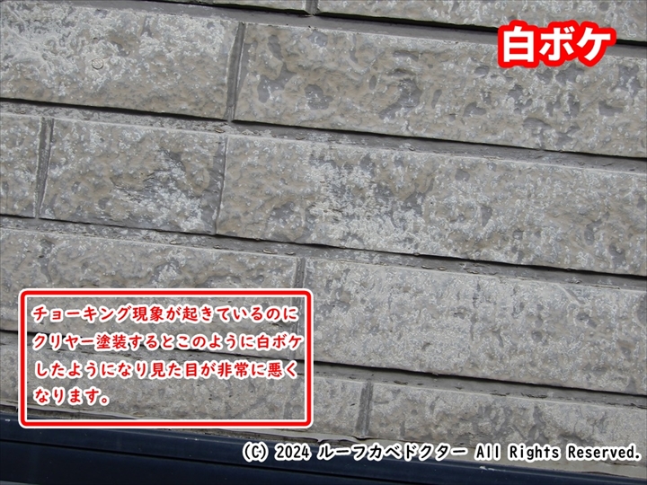 クリヤー塗装が不向きな位チョーキングが起きている状態で塗装してしまうと白ボケしたような状態になり見た目が非常に悪くなります。
