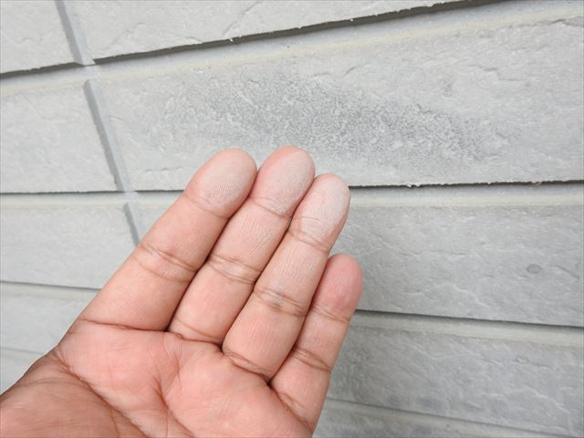 塗料の主成分には顔料と樹脂があります。チョーキング現象とは白亜化現象とも呼ばれ紫外線等により樹脂が分解され顔料が粉状に分離する現象を言います。劣化した塗装箇所に触れるとチョークの粉が付いたような白や外壁色の粉が手につきます。これが『チョーキング』です。汚れではなく劣化が原因のものがチョーキングになります。