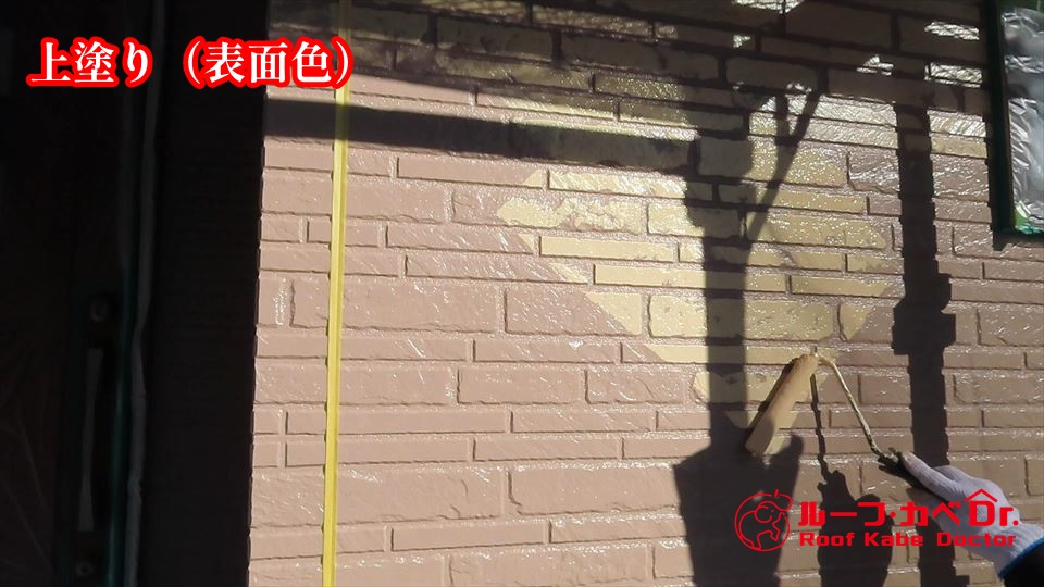短毛のローラーを使い凹み部分に表面色の塗料がつかないように塗布していきます。斜めにローラーを転がすことで凹み部分に表面色の塗料がつきにくくなるので凹み部分に塗料がつかない様に注意しながら表面色を仕上げていきます。
