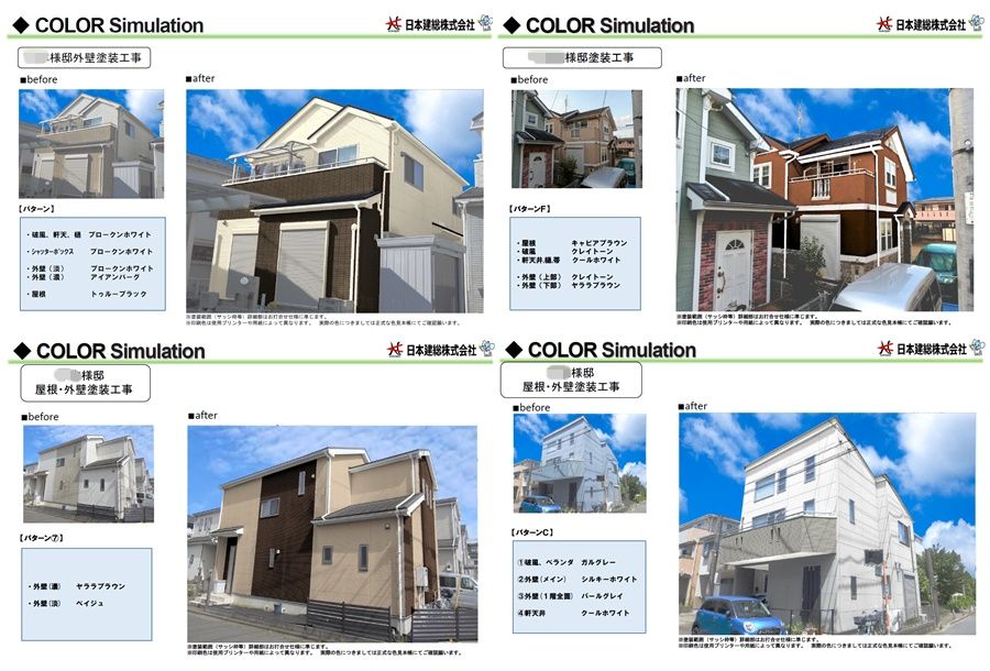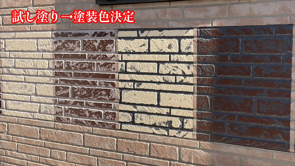 目地部分(凹部分)と表面色(凸部分)を違う色で塗るダブルトーンは外壁塗装の色選びの際に通常採用しているカラーシュミレーションでは表現できないので希望の数パターンに絞り込んだ後に、塗装する外壁の1部を使い試し塗りをして最終的に色決めを行います。実際に塗装する外壁に塗装するので比較してお気に入りの色を選ぶことができます。