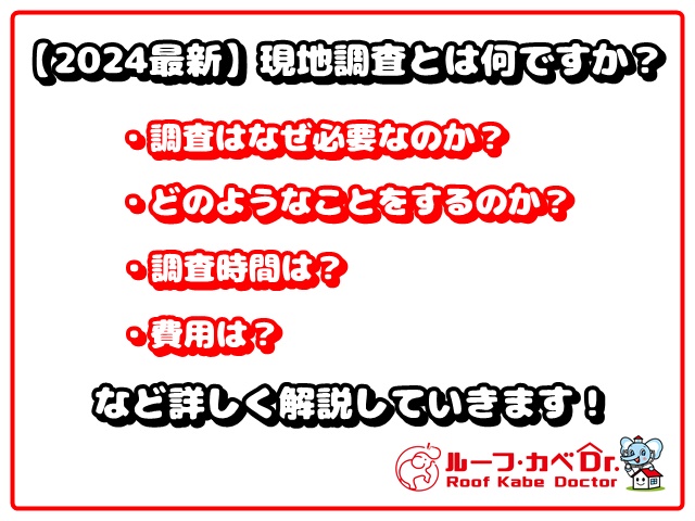 現地調査とは現地調査とは、問い合わせを頂いたお客様のところにお伺いして、建物の傷み、劣化状況を実際の現場で確認し、正確な御見積を作成する為に必要箇所の長さを計測することを言います。分かりやすく説明するとどこに問題があるのか?すぐに直す必要はないが経過観察が必要な箇所はどこか?大きさは?などを確認します。人間の体に例えると健康診断や検査のようなものです。余談にはなりますが弊社【ルーフカベドクター】の名前の由来は屋根・壁のお医者さんという意味からきています。なぜ現地調査が必要か建物各々、材料・構造・築年数・立地条件が違うので当然建物ごとに傷み具合が違うので最適な修繕の方法。おすすめの塗料なども違ってきます。お家の現状を把握する為の劣化診断報告書、最適な御見積作成の為に絶対に必要なのが現地調査です。調査当日の流れは1. ヒヤリング。ご依頼内容の確認2. 図面などの設計図書の有無の確認3. 御見積説明日時のご案内4. 調査スタートになります。現地調査はどのようなことをするのか【屋根】ドローンを使用して撮影を行い、主に以下の3点をチェックしていきます。1. 屋根材の種類は何か? スレート、金属、アスファルトシングル、瓦等どんな屋根材が使われているか確認します。2. 不具合箇所、劣化状況を確認します。 割れ、欠け、ズレ、反り、塗膜のはがれ等の不具合の有無、金属部のサビの有無、釘浮きの有無、変色、退色の程度、漆喰の状態を確認します。3. 御見積作成時に必要な箇所の長さを計測します。 ルーフカベドクター関連記事:【ドローンを活用した点検・調査】について詳しく解説しています。 【外壁】デジカメを使用して撮影を行い、主に以下の3点をチェックしていきます。劣化状況を確認するために触診、打診、テープを使用した調査も行います。1. 外壁材の種類は何か? 窯業系サイディング、金属系サイディング、ALC(軽量気泡コンクリート)、モルタル、タイル等どんな外壁材が使われているか確認します。2. 不具合箇所、劣化状況を確認します。 ひび割れ、チョーキング、変色、退色、色むら、汚れ、微生物の繁殖度合い、剥落、変形、塗膜のはがれ、浮き、シーリング材の傷み具合などを確認します。3. 御見積作成時に必要な箇所の長さを計測します。【付帯部】デジカメを使用して撮影を行い、主に以下の3点をチェックしていきます。1. 各箇所の使用材料を確認します。2. 不具合箇所、劣化状況を確認します。 サビの有無、ひび割れ、チョーキング、塗膜のはがれ、剥落、変形、シーリング材の傷み具合などを確認します。3. 御見積作成時に必要な箇所の長さを計測します。よくあるご質問 | Q&AQ1.どんな人が来ますか?A1.基本的には外壁診断士などの資格を持った営業がお伺い致します。Q2.事前に準備するものはありますか?A2.図面などの設計図書があると助かります。Q3.調査費用は?A3.無料です。特殊なケースで費用が発生する場合は事前にご案内致します。Q4.調査時間は?A4.概ね1時間前後です。まとめ現地調査は、建物の大きさや劣化状況を確認し適切な工事を行う為に必要な作業です。現地調査後、ご説明の日程に合わせて劣化診断報告書、御見積書を作成し、ご商談の際には疑問や不安がない様に分かりやすく説明しております。劣化診断報告書について(無料)ルーフカベドクターでは診断を基にしたお家の症状解決のご提案を致します。私たちが診断に力を入れる理由としてお家を長持ちさせたいという思いがあります。故に、お家を長持ちさせるためにも定期的なメンテナンスは必要でメンテナンスする前の劣化箇所を特定し原因をつきとめて対処していく必要があると考えております。ただし、診断結果はあくまでも現状のお家の劣化状況を知るということで処置が必要でない場合は、私たちはすぐにメンテナンスや修繕、塗装などをおすすめすることはありません。お客様の予算や状況を考えた上で最適かつ最善のご提案をしていきます。劣化診断報告書はお家の現状を把握し間違いのない工事をしてもらう為の一助になればと考え作成しております。お問い合わせルーフカベドクターは川越市を中心にして雨漏りに強い屋根塗装、外壁塗装の専門店です。塗装以外でもお家のことで気になることなどございましたら気軽にお問い合わせください。経験豊富なスタッフが親身になってお話を伺います。相談、調査、診断、御見積のご説明は無料です。電話でのお問い合わせメールでのお問い合わせ 2024年01月17日 更新迷ったら聞いてみよう!