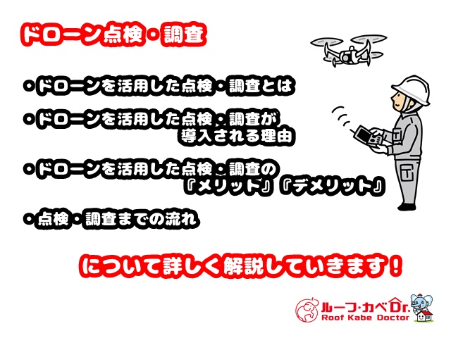 近年、屋根を中心にした高所の点検・調査は屋根に作業員が登って検査を行う方法からドローンを活用して撮影を行う方法に変化してきています。この記事では、ドローンを活用しての点検・検査について、導入される理由メリット・デメリット、飛行までの流れなどを中心に解説します。 ドローンを活用した点検・調査とはドローンを使い専門的な知識を持つ人が屋根や建物の高所の状態をチェックすることです。従来の方法はハシゴを使い屋根や該当箇所に登って行うもので、屋根の状態やハシゴをかけられない所では足場を組んで行うこともあります。手間も費用もかかるものでした。しかし、弊社が採用しているズーム機能付き4Kカメラを搭載したドローンを使って撮影を行えばハシゴをかけて上がらなくても状態を確認することができます。現在のカメラは高性能なので、細かなひび割れや板金のクギ浮きなども確認できます。ドローンを活用した点検・調査が導入される理由足場のない屋根など高所の点検・調査は大変危険な作業になります。転落すれば命を落とすこともあります。また、屋根は知識がある人が適切な方法をとれば破損するケースはほとんどありませんが、屋根の上を歩くので絶対に破損しないとは言い切れません。脆くなっている屋根材の場合は細心の注意を払って点検・調査を行わなければなりません。しかし、ドローンを活用した点検・調査では転落や転倒といった事故を防ぐことができ、ハシゴを使った点検・調査と比較して時間も短縮できます。従来のハシゴを使用する方法は、お客様が確認しにくいので業者によってはがいいかげんな点検・調査を行って不要な工事をした例もありました。ドローンを使用する方法は必要に応じてお客様がリアルタイムで撮影する画面を確認できるので誤魔化すようなことがやりづらいので公正な点検・調査が行えるのも支持される理由になっています。ドローンを活用した点検・調査の『メリット』『デメリット』【メリット3つ】1.上空さまざまな角度から撮影できる。屋根に上って撮影する画像より高度の高いところから撮影できるので屋根全体も映し屋根全体を確認することもできます。ズーム機能を搭載した4Kカメラで撮影するので屋根に上って近くで撮影した画像と遜色ないものが確認できます。2.屋根材を傷めず点検・調査ができる。屋根に上り屋根を歩くと屋根を傷める可能性があります。ドローンを活用すれば屋根に触れずに点検・調査を実施するので屋根を破損するリスクはありません。3.傾斜のきつい急勾配な屋根やハシゴをかけられない箇所でも点検・調査ができる。急勾配で屋根に上がれない、ハシゴが届かない3階建て以上の高所、隣家との距離が狭い所、ハシゴがかけられない住宅の形状の所でも点検・調査ができる。【デメリット3つ】1.エリアによっては飛ばせない地域がある。空港等の周辺の空域、緊急用務空域、150m以上の上空等、法律やルールの定めにより飛行できない場所や許可が必要な場所があります。上記のような飛行制限エリアでは弊社で使用しているドローンは然るべき手続きをしてロック解除をしないと飛行できない機種のものを使用しています。※許可が必要な空域は事前手続きを済ませてから飛行しています。2.点検・調査当日の天候に左右される。ハジゴを使用しての点検・調査同様に強風時や雨天時は調査できないこともあります。3.実際に触って確認することができない。実際に触らないと分からない傷みも存在します。先ずは、ドローンを用いた点検・調査を行い、専門的な知識を持つ者が画像を確認し、触診が必要と判断した場合は後日上っての点検・調査を実施致します。点検・調査までの流れ1.点検・調査日時を決める2.実施日に飛行できるよう各種手続きを行う3.変更なければ実施日時に調査スタートになります。よくあるご質問 | Q&AQ1.どんな人が操縦しますか?A1国土交通省東京航空局に申請して許可、承認された者が操縦します。Q2.操縦に免許は必要ですか?A2.2024.1.23現在、弊社が行うような飛行では免許は不要です。Q3.保険に加入していますか?A3.万一に備え必要な保険に加入しています。Q4.調査費用は?A4.無料です。Q5.調査時間は?A5.5~10分前後です。まとめドローンを活用した点検・調査は、安全に短時間で行えます。ドローンを活用して点検・調査の透明性を高め撮影した画像をベースに現在の状態をご説明します。屋根など高所の点検商法にご注意近年、近所で工事を行うので挨拶に来た等で突然訪問し、屋根に問題があります等で不安を煽りすぐに見積を作成してその場で契約をしてくる点検商法が全国的に増加しているため注意が必要です。被害にあわないために突然訪問してきた業者には安易に点検させず、少しでも不安を感じた場合はすぐに消費生活センター等に相談してください。屋根等指摘箇所が気になって心配な場合は訪問業者以外で2~3社調査を依頼することをおすすめします。