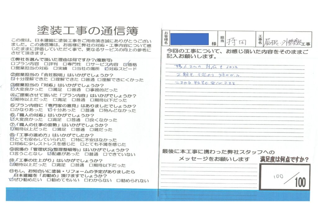 【川越市】屋根塗装・外壁塗装工事 I様外壁塗装・屋根塗装 2022.04.30 (Sat) 更新 お客様から頂いた評判の声 細かな報告で安心できました! 職人さんの対応もよかった。 工期も予定より短かった。 細かな対応で安心できた。 施工担当者よりメッセージ 【川越市】屋根塗装・外壁塗装工事 I様 施工データ 工事内容 外壁塗装・屋根塗装 外壁塗装屋根塗装 次の記事 一覧 前の記事 迷ったら聞いてみよう! 相談診断お見積り無料 0120-89-1152受付/9:30~18:00(月・木曜日定休) お問い合わせ・お見積り ショールーム来店予約