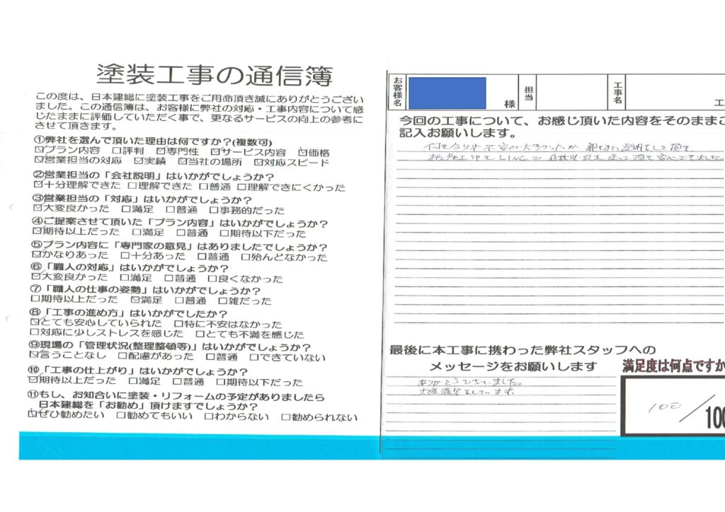 【川越市】屋根塗装・外壁塗装工事 N様 2022.07.08 (Fri) 更新 お客様から頂いた評判の声 施工中LINEで進歩状況を送ってくれて安心できました! 何も分からず不安も大きかったが親切に説明をして頂きまた施工中もLINEで進歩状況を送って頂き安心できました。 【スタッフへのメッセージ】 ありがとうございました。 大変満足をしています。 施工担当者よりメッセージ 【川越市】屋根塗装・外壁塗装工事 N様 施工データ 次の記事 一覧 前の記事 迷ったら聞いてみよう! 相談診断お見積り無料 0120-89-1152受付/9:30~18:00(月・木曜日定休) お問い合わせ・お見積り ショールーム来店予約