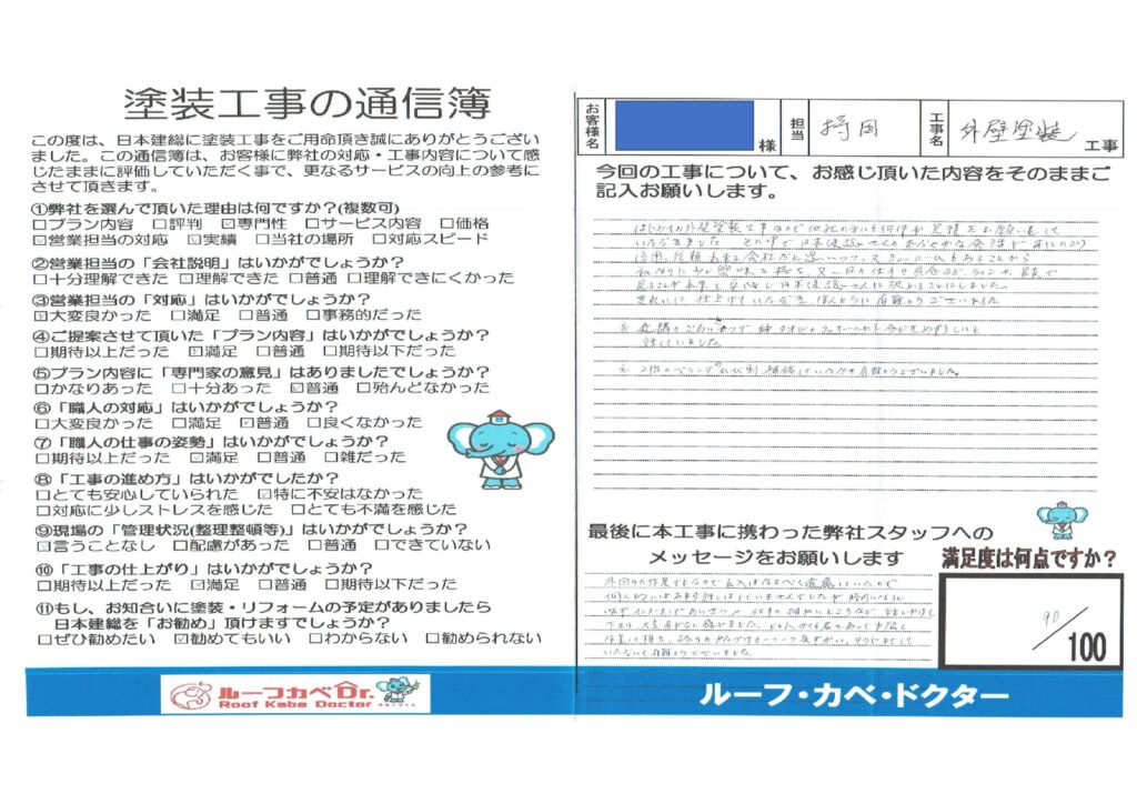はじめての外壁塗装工事なので他社の方にも何件か見積もりをお願いしていただきました。その中で日本建総さんのおだやかな会話が耳にのこり信用信頼出来る会社だと思いつつ、又ショールームもあることから私なりに少し興味を持ち、又、一回の仕事の具合など、ラインや、写真で見ることが出来安心し日本建総さんに決めることにしました。