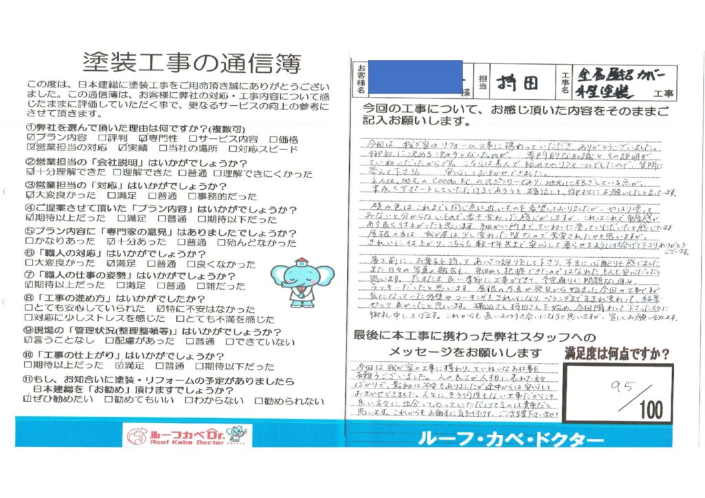 また、写真の日々の報告も、細かく、把握できたのではなれた主人も安心だったと思います。屋根の不良から始まった今回の工事ですが気になっていた外壁やコーキングもきれいになり、ベランダまで生まれ変わった、結果やって良かったと思います。礒辺さん持田さんを始め、今回関わって下さった方々に御礼申し上げます。これからも長い付き合いになると思いますが、宜しくお願い致します。