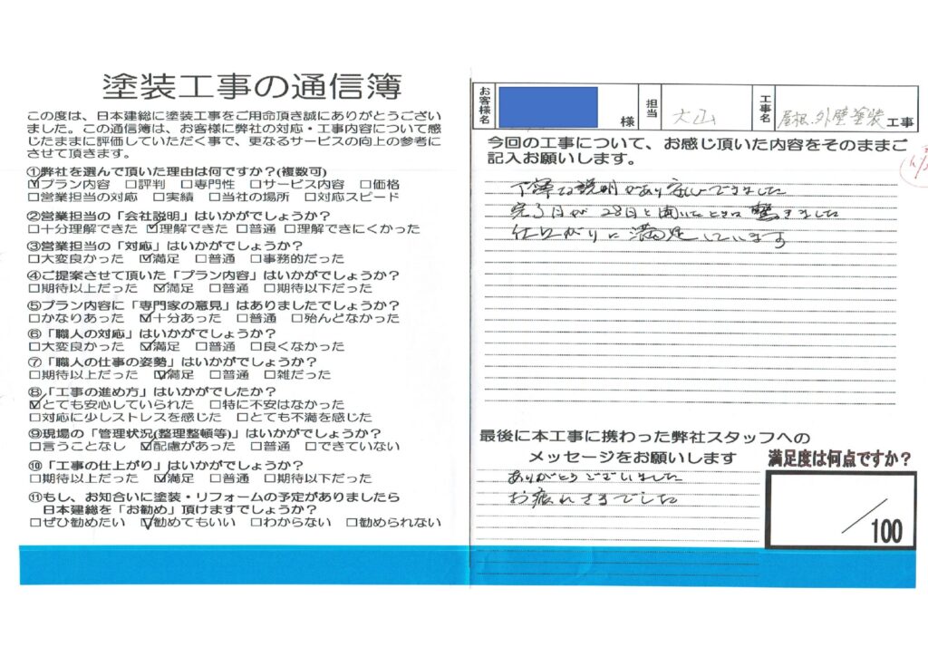 【川越市外】屋根・外壁塗装工事 M様外壁塗装・屋根塗装 2022.07.08 (Fri) 更新 お客様から頂いた評判の声 丁寧で安心できました! 丁寧な説明があり安心できました。 完了日が28日と聞いたときは驚きました。 仕上がりに満足しています。 【スタッフへのメッセージ】 ありがとうございました。 お疲れ様でした。 施工担当者よりメッセージ 【川越市外】屋根・外壁塗装工事 M様 施工データ 工事内容 外壁塗装・屋根塗装 外壁塗装屋根塗装 次の記事 一覧 前の記事 迷ったら聞いてみよう! 相談診断お見積り無料 0120-89-1152受付/9:30~18:00(月・木曜日定休) お問い合わせ・お見積り ショールーム来店予約