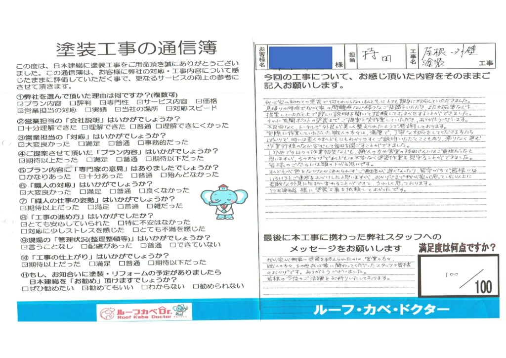LINEでの日々の作業報告なども、職人の方や営業の持田さんにはご負担だったと思いますが、そのおかげで私どもは不安なく塗装作業を見守ることができました。