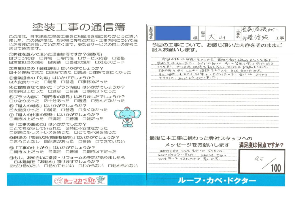 今回4社から見積りをいただき、御社を含めて2社からドローンを使った診断をしてもらいました。ひじょうに細かく多くの写真を使った診断だったこともあり、プラン内容を日々LINEで確認できたのもとても良かったです。