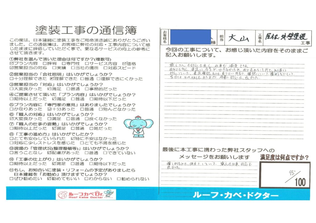 川越市】屋根外壁塗装工事 K様外壁塗装・屋根塗装 2022.07.28 (Thu) 更新 お客様から頂いた評判の声 対応よく満足できました!! 職人さんの対応も良く、仕事も満足できる。 雨なども多く連続して作業が出来なかったが雨で色落ちした所もぬり直して対応していた。 最終確認なども見づらい所まで確認していて補しゅうなどもして家回りのぺンキのあともかたづけて非常に対応は良かった。 【スタッフへのメッセージ】 補しゅうなども細目にしていて、職人の仕事、対応も良かった。 施工担当者よりメッセージ 川越市】屋根外壁塗装工事 K様 施工データ 工事内容 外壁塗装・屋根塗装 外壁塗装屋根塗装 次の記事 一覧 前の記事 迷ったら聞いてみよう! 相談診断お見積り無料 0120-89-1152受付/9:30~18:00(月・木曜日定休) お問い合わせ・お見積り ショールーム来店予約