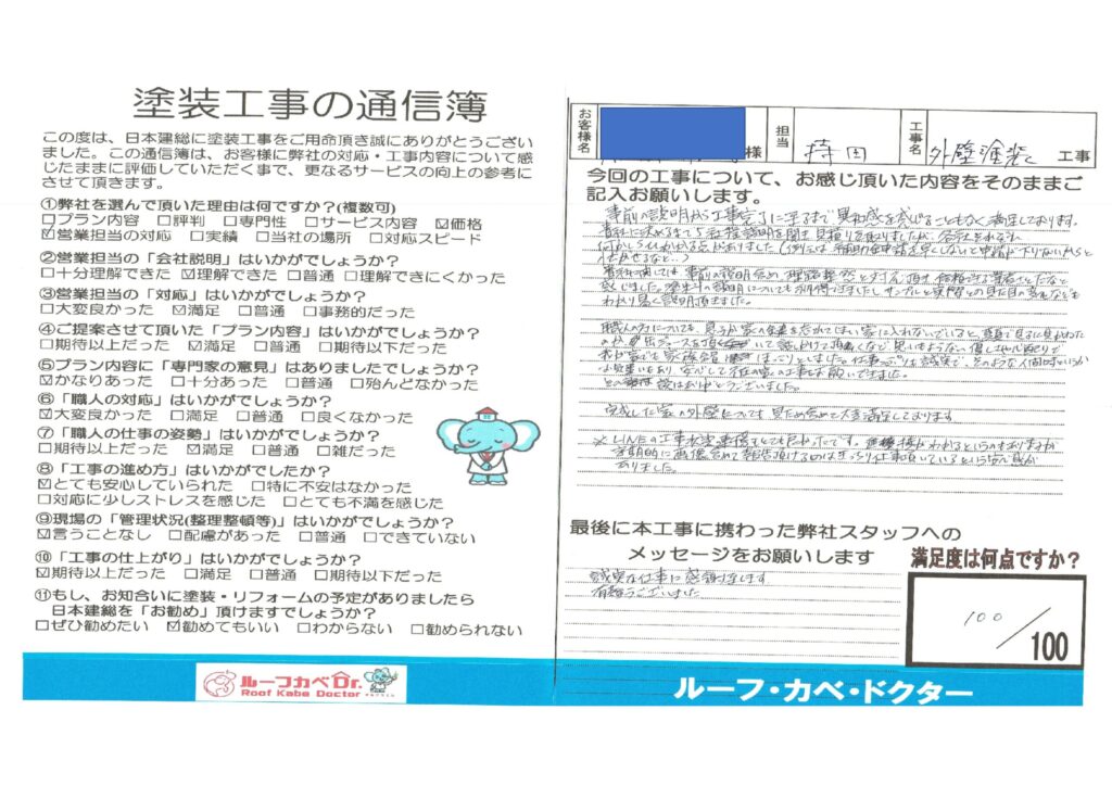 貴社に関しては事前の説明含め、理路整然と対応頂き、信頼できる業者さんだなと感じました。塗料の説明についても納得できましたし、サンプルと実際知の見た目の変化などもわかり易く説明頂きました。
