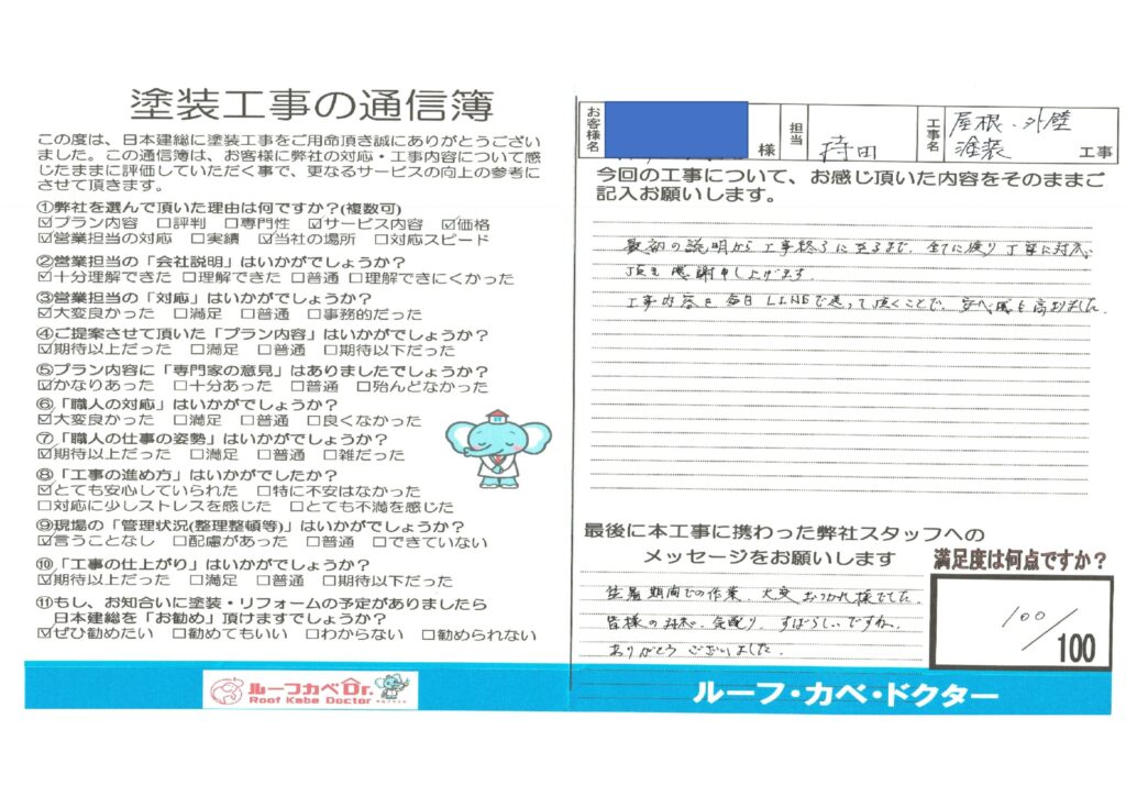 【川越市】屋根・外壁塗装工事 S様外壁塗装・屋根塗装 2022.08.11 (Thu) 更新 お客様から頂いた評判の声 毎日のLINEで安心感が高まりました!!! 最初の説明から工事終了に至るまで、全てに渡りていねいに対応頂き感謝申し上げます。 工事内容を毎日LINEで送って頂くことで安心感も高まりました。 【スタッフへのメッセージ】 猛暑期間での作業大変おつかれ様でした。 皆様の対応、気配りすばらしいですね。 ありがとうございました。 施工担当者よりメッセージ 【川越市】屋根・外壁塗装工事 S様 施工データ 工事内容 外壁塗装・屋根塗装 外壁塗装屋根塗装 次の記事 一覧 前の記事 迷ったら聞いてみよう! 相談診断お見積り無料 0120-89-1152受付/9:30~18:00(月・木曜日定休) お問い合わせ・お見積り ショールーム来店予約
