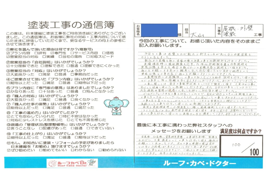 会長様、社長様、営業担当者様、皆様のおかげで大変満足のいく工事を行って頂き御社にお願いして良かったです。次の工事の時期の頃は自分ではなく子供達が考えることになると思いますが、その際にはまた声をかけさせますのでご協力のほどよろしくお願い申し上げます。本当にありがとうございました。